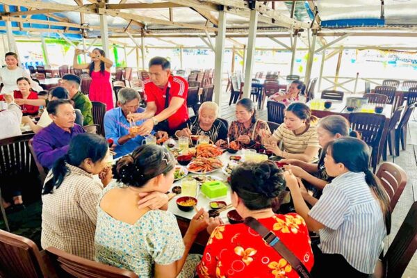 - 11h00: Quý khách lên tàu về lại nhà bè tắm lại nước ngọt và thưởng thức bữa trưa BBQ với các món hải sản tươi ngon và đặc biệt với Tôm Hùm.